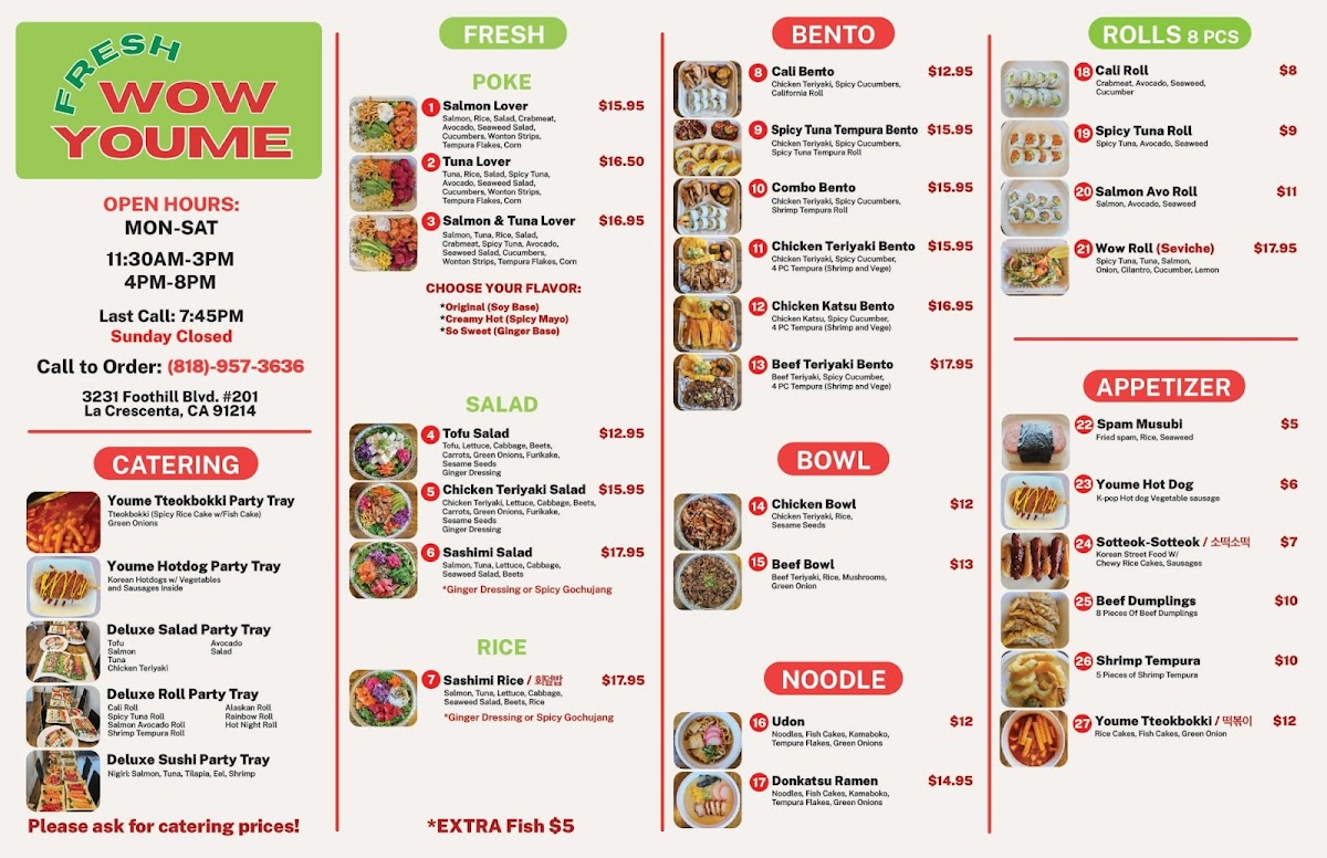 Wow Youme | Poke In Love | Wow Bento&Roll offers a vibrant fusion of Asian flavors focused on fresh, fast, and satisfying meals. Located in Glendale, CA, this spot expertly blends Japanese, Korean, and Hawaiian influences through their signature poke bowls, bento sets, and tteokbokki dishes. The poke bowls stand out with premium-quality salmon, tuna, and crabmeat layered over rice, complemented by avocado, seaweed salad, and crispy tempura flakes—each bowl a perfect harmony of texture and flavor.